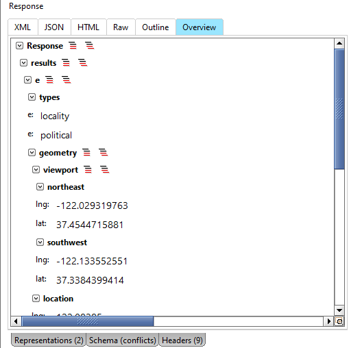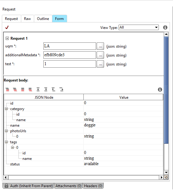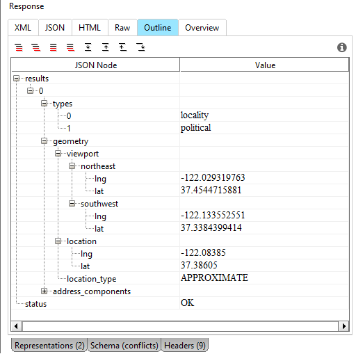 This view makes it easier to work with payloads that have complex JSON or XML data structures. It shows a tree-view over the message body (only applicable for POST and PUT requests). For example, the following structure in the message body will result in the following Outline view: