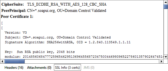 If a request was send over an SSL connection (that is, to an https://… resource), this view will show detailed information on the security certificates and certificate chain of the target server: