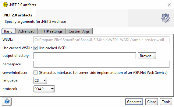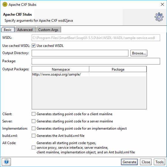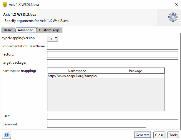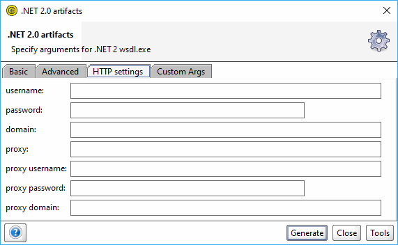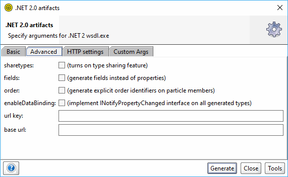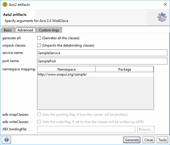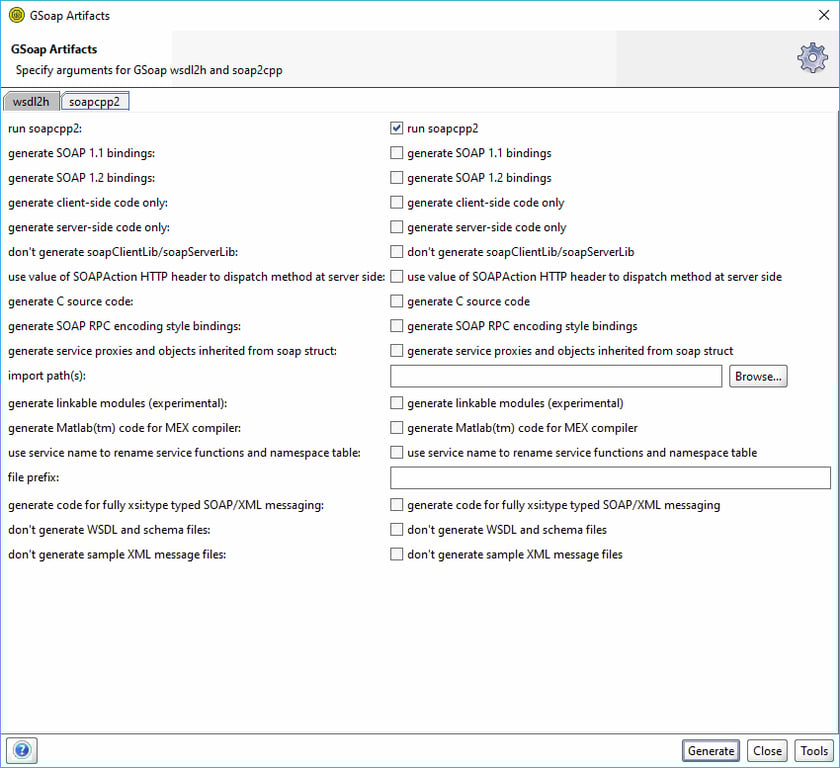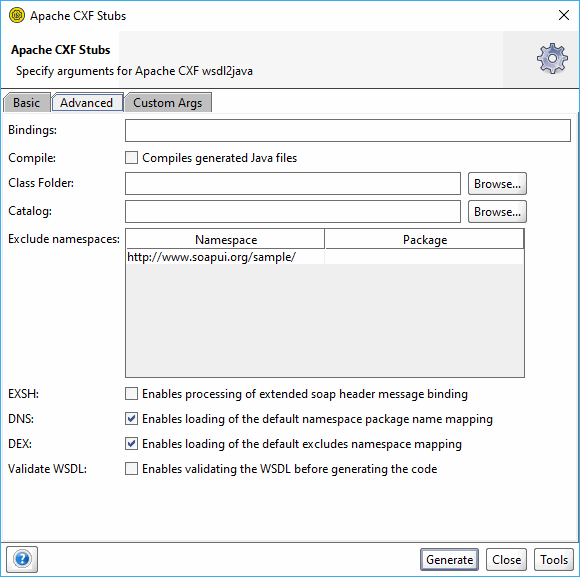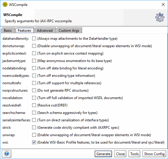 Each integration has a number of tabs for configuring the corresponding tools options and adding arbitrary command line arguments. If the tool is invoked from the Interface menu, relevant values will be pre entered into the dialogs (WSDL URL, Namespaces, etc.) and the integrations remember their settings, making it easy to rerun the desired tools if changes are made to the external sources or WSDLs.