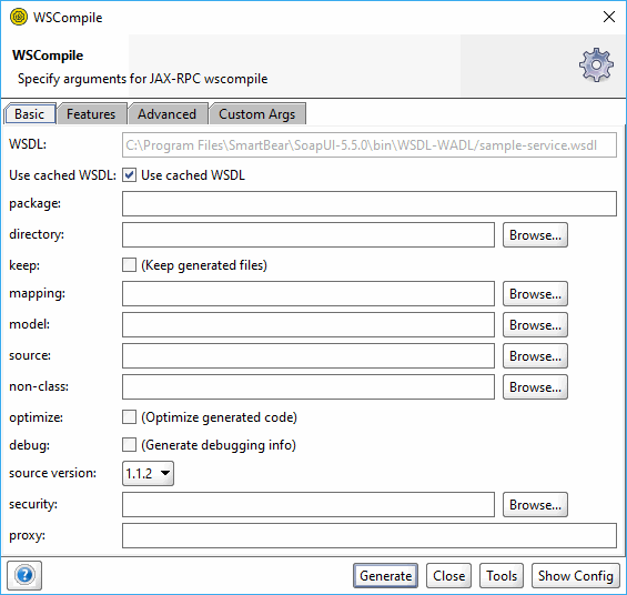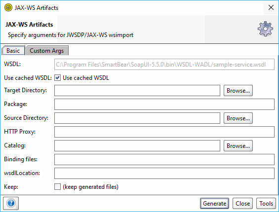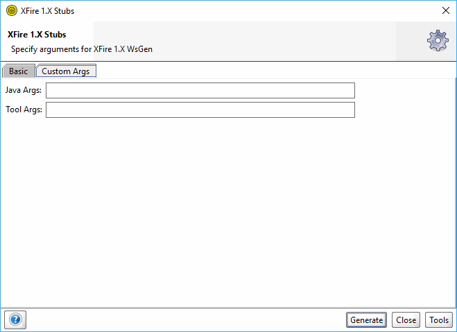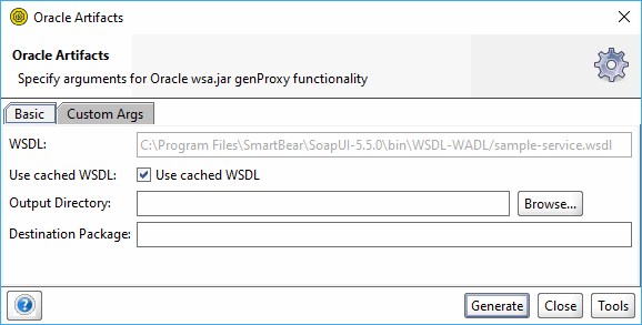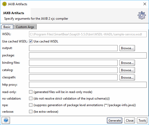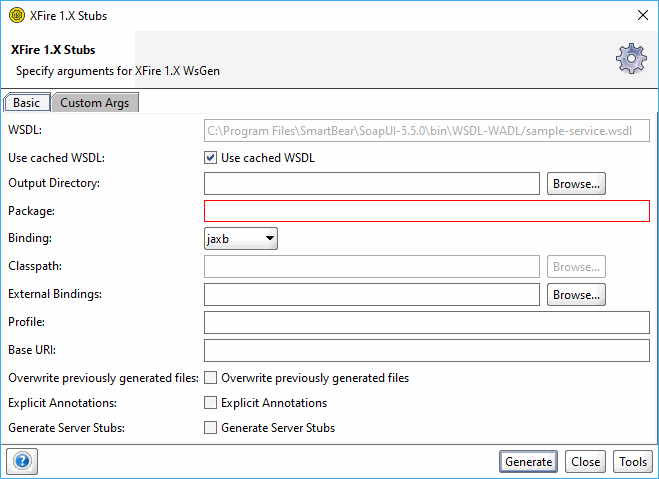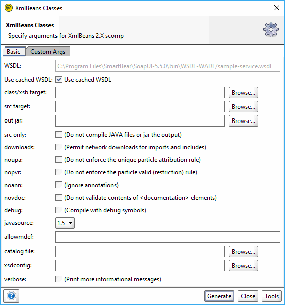 All integrations have a “Custom args” tab allowing the specification of custom arguments to the invoked tool(s), for example those that are not supported by SoapUI in intermediate versions (before we catch up :-). The following dialog for the XFire integration allows both custom args to java and to the WsGen tool itself: