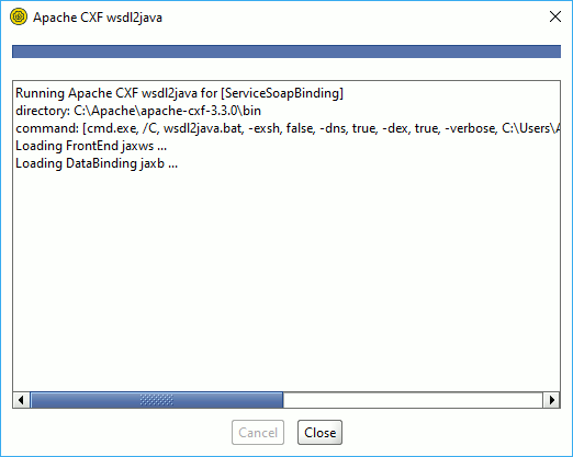 Once the tool is configured as required by its dialog, a “Generate” option will open a separate window showing the input or output of the invoked tools process. During the process execution a “Cancel” button will be available for canceling the ongoing process, otherwise a success/error message will be shown when the tool is finished. The log window will be available until it is closed allowing detailed viewing of the process output (for debugging purposes…). The following image shows the process runner window after a successful invocation to the JWSDP WSCompile tool: