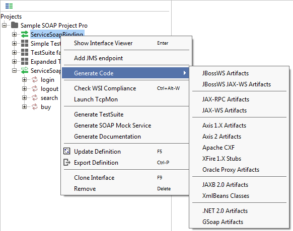 The following code generation tools have currently been integrated and are available from the main Tools menu or form the Interface right-button menu: JBossWS WSTools, JBossWS WSConsume, JAX-RPC, JAX-WS, Axis 1.X, Axis 2, CXF 2.X, XFire 1.X, Oracle wsa, XmlBeans 2.X, JAXB 2.X, GSoap 2.X and .NET 2.0.