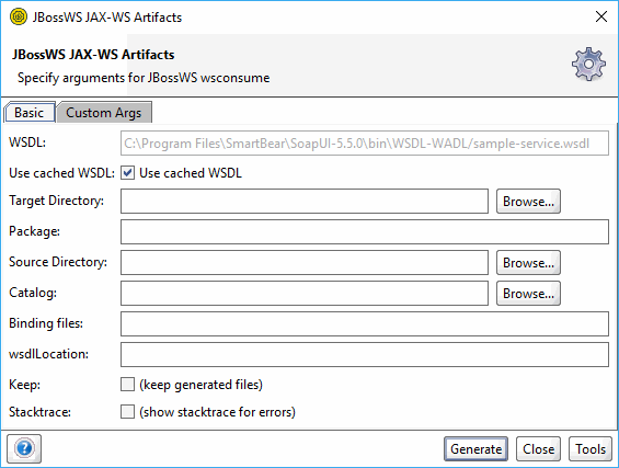 Install the latest JBossWS stack and install/configure as required. Specify the directory containing the wstools script in the Tool Integrations settings dialog. The dialog has a “Show Config” button that displays the wstools config file generated for the current settings.